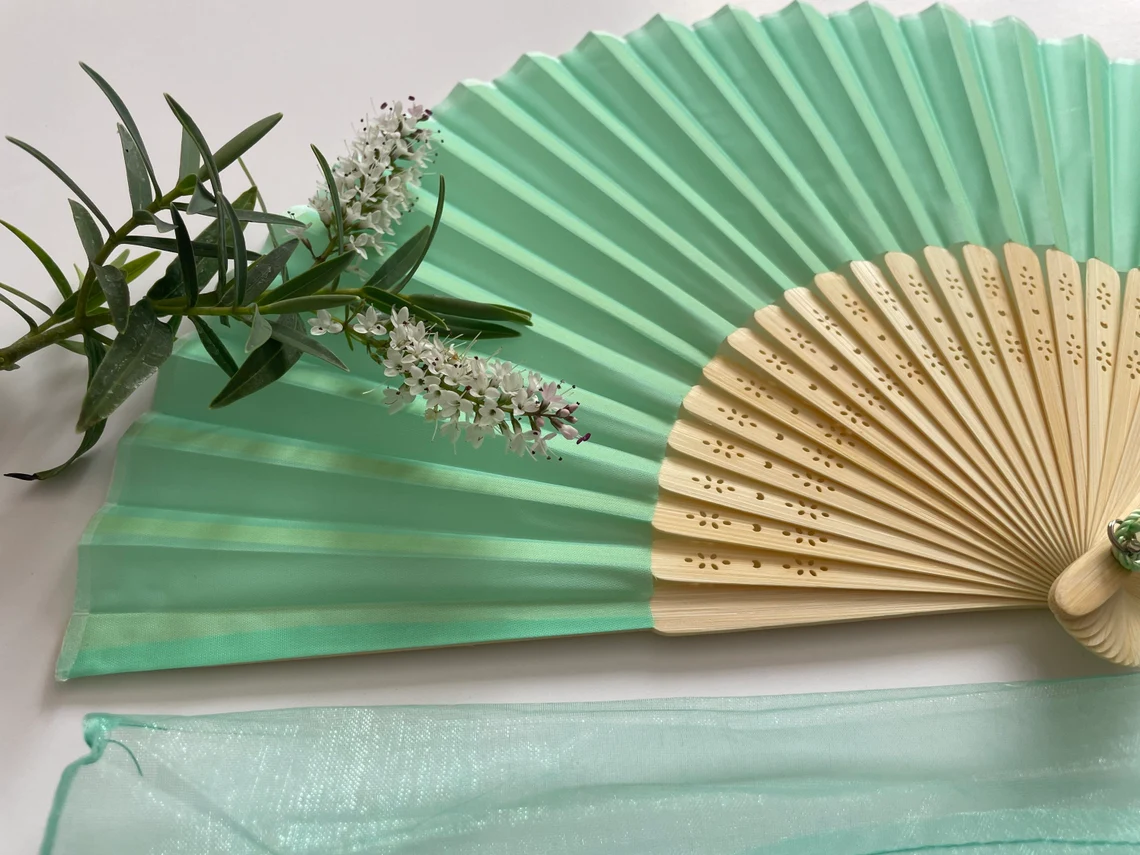 Light Turquoise colour Fabric Fan with a Tassel Grade A Bamboo Ribs Wedding Party Favour Handheld Fan