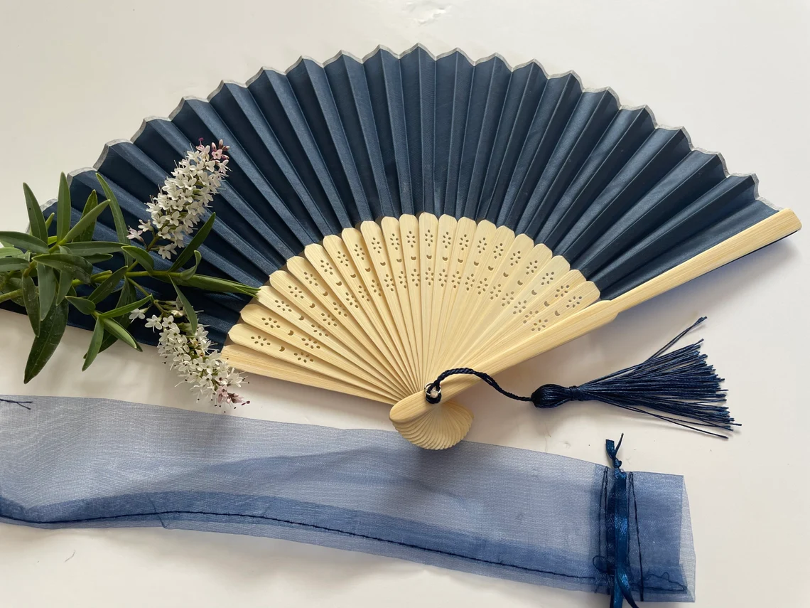 Navy Blue (Dark ) colour Silk Fabric Fan with a Tassel Grade A Bamboo Ribs Wedding Party Favour Handheld Fan